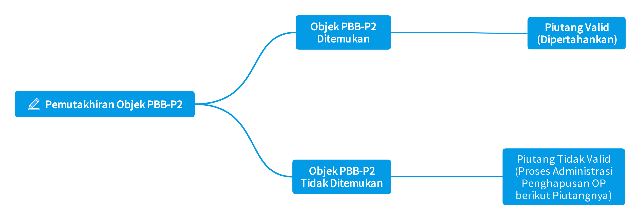 Kegiatan ini berfokus pada pemutakhiran data dengan tujuan yang ketiga, yaitu memastikan data piutang dapat dijadikan acuan untuk proses penagihan secara periodik. Konteks kegiatan pemutakhiran data piutang sangat erat kaitannya dengan proses pemutakhiran objek PBB-P2, dimana data objek PBB-P2 yang ada harus terlebih dahulu diperiksa, yang diketemukan akan dimutakhirkan sesuai kondisi saat ini dan yang tidak diketemukan akan diproses dengan pembuatan berita acara dengan pihak-pihak terkait dalam rangka proses penghapusan data objek PBB-P2 tersebut beserta piutangnya. Proses ini dapat digambarkan melalui diagram sebagai berikut :